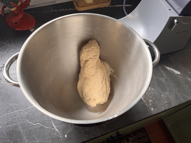 Weigh all the dry ingredients above (except the last four – milk, butter, egg yolk/sugar and sesame seeds) and put in the stand mixing bowl.  (I actually weigh the stuff right in the mixing bowl that goes on the stand mixer).  Mix well with a dough hook.