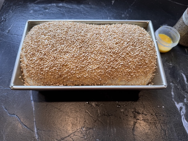 Once risen an inch over the edge of the bread pan,remove the pan from the rising spot and remove the plastic wrap.  Brush lightly with the beaten yolk and sprinkle with lots and lots of TOASTED sesame seeds all over the top.  I very gently press these into the top of the bread.  Bake the bread for 33-38 minutes until a digital thermometer stuck into the center registers at least 190 degrees.