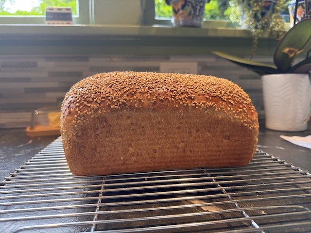 This recipe originally came from the King Arthur website and was titled “back of the bag Oatmeal Bread.”  First of all, I weighed every single ingredient so there is zero room for error.  My best touch, however, is that I use a LOT of toasted sesame seeds and an egg yolk wash to help them stick to the top of the bread.  To me, this is what makes this bread so delicious.  It could not be easier to make or to clean up if you make this with a dough hook in your large mixer.