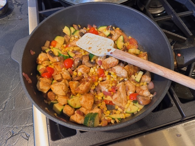 Heat the other 2 Tbsp of olive oil and then add the onion. Saute for 3 minutes until it is translucent. Add the garlic and saute another minute. Add the corn, zucchini, tomatoes, and mushrooms, salt and pepper and cook until the vegetables become a little soft.